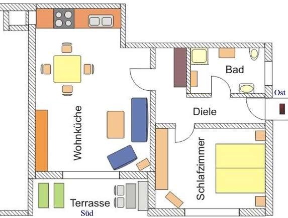 Die Ferienwohnung umfasst 55 m² bei 3 Räumen: Wohnraum mit Küchenzeile und Essecke, Schlafraum, Bad